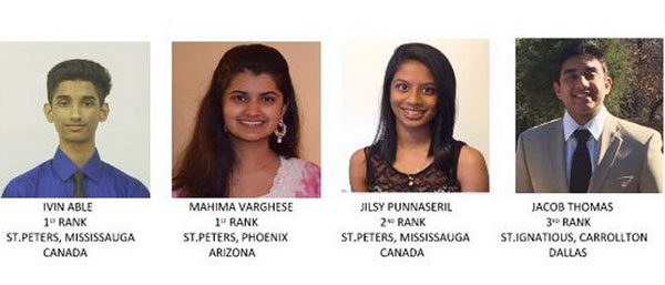 കാനഡ: നോര്ത്ത് അമേരിക്കന് മലങ്കര അതിഭദ്രാസന സണ്ഡേ സ്കൂള് 10ാം ക്ലാസ് പരീക്ഷയില് ഐവിന് ഏബില്(സെന്റ് പീറ്റേഴ്സ് ചര്ച്ച്, മിസ്സിസാഗോ, കാനഡ), മഹിമ വര്ഗീസ് (സെന്റ് പീറ്റേഴ്സ് ചര്ച്ച്, ഫിയോനിക്സ്) എന്നിവര് ഒന്നാം റാങ്കും ജില്സി പുന്നശ്ശേരില് (സെന്റ് പീറ്റേഴ്സ് ചര്ച്ച് മിസ്സിസാഗോ, കാനഡ) രണ്ടാം റാങ്കും, ജേക്കബ് തോമസ്(സെന്റ് ഇഗ്നേഷ്യസ് കത്തീഡ്രല് ഡാലസ്) മൂന്നാം റാങ്കും കരസ്ഥമാക്കി.