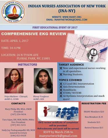 ന്യൂയോര്‍ക്ക് : ആതുര സേവനരംഗത്തും സാമൂഹ്യപ്രവര്‍ത്തന രംഗത്തും അമേരിക്കന്‍ മലയാളി സമൂഹത്തില്‍ നിറ സാന്നിധ്യമായ ഇന്ത്യന്‍ നേഴ്‌സസ് അസോസിയേഷന്‍ ന്യൂ യോര്‍ക്ക് ചാപ്ടര്‍ ഏപ്രില്‍ ഒന്നിന് വിദ്യഭ്യാസ ഏകദിന സെമിനാര്‍ സംഘടിപ്പിക്കുന്നു. ന്യൂയോര്‍ക്ക് ഫ്‌ലോറല്‍പാര്‍ക്ക് 26 നോര്‍ത്ത് ടൈസണ്‍ അവന്യൂവില്‍ (26 N Tyson Ave, Floral Park, NY 11001), സംഘടിപ്പിക്കുന്ന “കോംപ്രിഹെന്‍സീവ് ഇ കെ ജി റിറ്വ്യൂ”സെമിനാറില്‍ പ്രിയാ മാത്യു ചിറയില്‍, ബ്ലെസ്സി വര്‍ഗീസ് എന്നിവര്‍ ക്‌ളാസുകള്‍ നയിക്കും. ആതുര സേവന രംഗത്തു പ്രവര്‍ത്തിക്കുന്നവരും, നേഴ്‌സിങ് വിദ്യാര്‍ത്ഥികള്‍ക്കും ഈ സെമിനാറില്‍ പങ്കെടുക്കുാം.