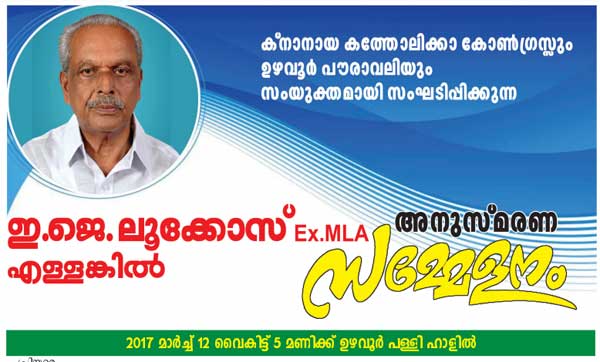 നിയമസഭാ സാമാജികന്, രാഷ്ട്രീയനേതാവ്, സാമൂഹ്യ പ്രവര്ത്തകന്, സമുദായ സ്നേഹി, അദ്ധ്യാപകന് , സഹകാരി എന്നിങ്ങനെ വിവിധ തുറകളില് തന്റേതായ വ്യക്തി മുദ്രപതിപ്പിച്ച ഉഴവൂരിന്റെ പ്രീയങ്കരാനയ ജനനായകന് ഇ.ജെ. ലൂക്കോസ് എള്ളങ്കില് എക്സ്.എം.എല്.എ. നമ്മില് നിന്നും വേര്പിരിഞ്ഞിട്ട് 2017 മാര്ച്ച് 12ന് 5 വര്ഷം പൂര്ത്തിയാകുന്നു. അദേഹത്തിന്റെ ചരമവാര്ഷിക ദിനത്തില് ഉചിതമായ രീതിയില് ഒരു അനുസ്മരണ സമ്മേളനം ഉഴവൂരില് ക്നാനായ കത്തോലിക്കാ കോണ്ഗ്രസും, ഉഴവൂര് പൗരാവലിയും ചേര്ന്ന് സംഘടിപ്പിക്കുന്നു.