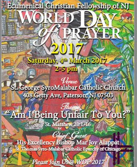 ന്യൂജഴ്സി: ലോകമൊട്ടാകെയുള്ള വിവിധ ക്രൈസ്തവ സഭകളിലെ വനിതകളുടെ എക്യൂമെനിക്കല് കൂട്ടായ്മ ആഗോള തലത്തില് എല്ലാ വര്ഷവും നടത്തി വരാറുള്ള വേള്ഡ് ഡേ ഓഫ് പ്രെയര് 2017 മാര്ച്ച് 4 ശനിയാഴ്ച എക്യൂമെനിക്കല് ക്രിസ്ത്യന് ഫെലോഷിപ്പ് ഓഫ് ന്യൂജഴ്സിയുടെ ആഭിമുഖ്യത്തില് പാറ്റേഴ്സണ് സെന്റ് ജോര്ജ് സിറോ മലബാര് കത്തോലിക്കാ ദേവാലയത്തില് നടത്തുന്നു. ഓരോ വര്ഷവും ഓരോ രാജ്യങ്ങളാണു പ്രാര്ഥനാ രീതികളെക്കുറിച്ചു പ്രബന്ധങ്ങള് ചിട്ടപ്പെടുത്തുന്നത്. അതിനായി ഈ വര്ഷം തിരഞ്ഞെടുത്തിരിക്കുന്നത് ഫിലിപ്പീന്സിനെയാണ്. മാര്ച്ച് 4 ശനിയാഴ്ച ഉച്ചയ്ക്ക് 2നാരംഭിക്കുന്ന പ്രാര്ഥനാ സമ്മേളനത്തിനു സിറോ മലബാര് ഷിക്കാഗോ രൂപതാ മെത്രാന് ബിഷപ്പ് മാര് ജോയ് ആലപ്പാട്ട് നേതൃത്വം വഹിക്കും. പ്രസിഡന്റ് റവ : ഫാദര് ജേക്കബ് ക്രിസ്റ്റി അധ്യക്ഷനായിരിക്കും, രണ്ടു മണിക്ക് നടക്കുന്ന പ്രദക്ഷിണത്തോടെ ചടങ്ങുകള് ആരംഭിക്കും, ന്യൂജഴ്സിയിലെ വിവിധ സിറോ മലബാര് കത്തോലിക്കാ സഭ, മലങ്കര സിറിയന് ഓര്ത്തഡോക്സ് സഭ, മാര്ത്തോമാ സഭ, സിറോ മലങ്കര കത്തോലിക്കാ സഭ, ചര്ച്ച് ഓഫ് സൗത്ത് ഇന്ത്യ, ഇന്ത്യന് ഓര്ത്തഡോക്സ് സഭ ദേവാലയങ്ങളില് നിന്നും പുരോഹിത ശ്രേഷ്ടരും അല്മായരും ഈ പ്രാര്ഥനാ സമ്മേളനത്തില് പങ്കെടുക്കും,