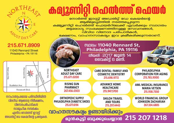 ഫിലാഡല്ഫിയ: നോര്ത്ത് ഈസ്റ്റ് അഡള്ട്ട് ഡേ കെയറിന്റെ ആഭിമുഖ്യത്തില് നടത്തപ്പെടുന്ന കമ്യൂണിറ്റി ഹെല്ത്ത് ഫെയര് ജൂണ് 14-നു ബുധനാഴ്ച വൈകിട്ട് 6 മണി മുതല് നോര്ത്ത് ഈസ്റ്റ് അഡള്ട്ട് ഡേ കെയര് സെന്ററില് വച്ചു (11040 റെനാര്ഡ് St, ഫിലാഡല്ഫിയ , പി.എ 19116) നടത്തപ്പെടുന്നു.