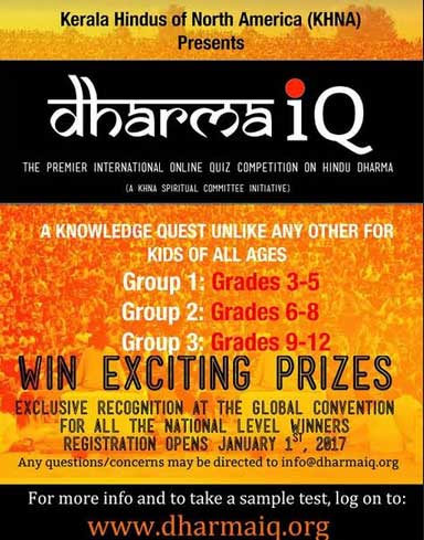 2017 മാര്‍ച്ച് അഞ്ചാം തീയതിയാണ് മത്സരം. മത്സരത്തില്‍ പങ്കെടുക്കുന്ന എല്ലാവര്‍ക്കും കെ.എച്ച്.എന്‍.എ സര്‍ട്ടിഫിക്കറ്റ് നല്കുന്നതാണ്. മത്സരവിജയകള്‍ക്ക് അവാര്‍ഡ് കൂടാതെ പ്രത്യേക സമ്മാനങ്ങളും നല്‍കുന്നതാണ്. കൂടുതല്‍ വിവരങ്ങള്‍ക്ക് അടുത്തുള്ള കെ.എച്ച്.എന്‍.എ കോര്‍ഡിനേറ്ററേയോ അല്ലെങ്കില്‍ info@dharmaiq.org എന്ന ഇമെയില്‍ വഴിയോ ബന്ധപ്പെടുക. സതീശന്‍ നായര്‍ അറിയിച്ചതാണിത്.