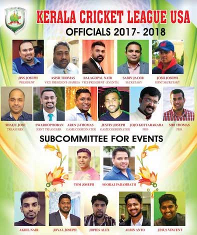 ന്യൂയോര്ക്ക് :കേരള ക്രിക്കറ്റ് ലീഗ് 2017 -2018 ഭാരവാഹികളെ തിരഞ്ഞെടുത്തു, കഴിഞ്ഞ രണ്ടു വര്ഷത്തിനുള്ളില് അമേരിക്കന് മലയാളികളുടെ മനസ്സില് ഇടംനേടിയ KCL ഈ വര്ഷം വളരെ പുതുമകളോടെ ആണ് മുന്നോട്ടുവരുന്നതെന്ന് പുതിയ ഭാരവാഹികള് അറിയിച്ചു .