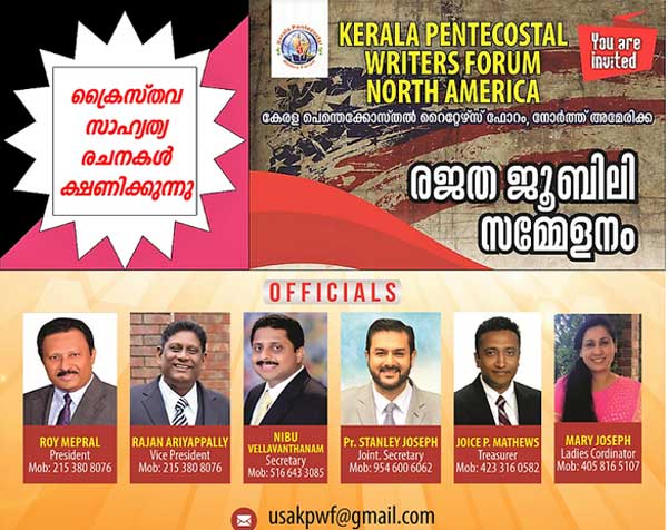 ന്യുയോര്ക്ക്: കേരള പെന്തക്കോസ്തല് റൈറ്റേഴ്സ് ഫോറം ഓഫ് നോര്ത്ത് അമേരിക്ക സില്വര് ജൂബിലി ആഘോഷങ്ങളുടെ ഭാഗമായി നടത്തപ്പെടുന്ന െ്രെകസ്തവ സാഹിത്യ സൃഷ്ടികളുടെ മത്സരത്തിലേക്ക് രചനകള് അയയ്ക്കേണ്ട അവസാന തീയതി മെയ് 30 വരെയായി പുനക്രമീകരിച്ചു.