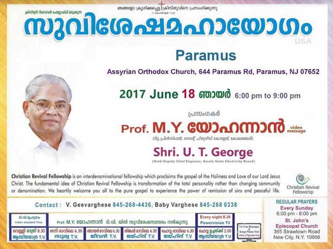 പരാമസില് അസീറിയന് ഓര്ത്തഡോക്സ് ചര്ച്ചില് വച്ചു (644 Paramus Rd, Paramus, NJ 07652) ഞായറാഴ്ച വൈകിട്ട് 6 മുതല് 9 വരെ നടക്കുന്ന യോഗത്തില് വി.ടി. ജോര്ജ് (റിട്ടയേര്ഡ് ഡപ്യൂട്ടി ചീഫ് എന്ജിനീയര്, കേരളാ സ്റ്റേറ്റ് ഇലക്ട്രിസിറ്റി ബോര്ഡ്) വചന ശുശ്രൂഷ നടത്തുന്നതാണ്. ലോകപ്രശസ്ത സുവിശേഷകന് പ്രൊഫസര് എം.വൈ യോഹന്നാന് (കോലഞ്ചേരി) തത്സമയ വീഡിയോ സംപ്രേക്ഷണത്തിലൂടെ തിരുവചന സത്യങ്ങള് ഉദ്ഘോഷിക്കും. അനുഗ്രഹീതമായ സുവിശേഷ യോഗത്തിലേക്ക് ഏവരേയും കതൃനാമത്തില് സ്വാഗതം ചെയ്യുന്നതായി ഭാരവാഹികള് അറിയിക്കുന്നു. കൂടുതല് വിവരങ്ങള്ക്ക്: വി. വര്ഗീസ് (845 268 4436), ബേബി വര്ഗീസ് (845 268 0338). ബിജു ചെറിയാന് അറിയിച്ചതാണിത്.