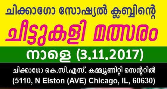 ചിക്കാഗോ സോഷ്യല് ക്ലബ് ചീട്ടുകളി മത്സരം മാര്ച്ച് 11-ന് Posted on March 11, 2017 by Staff Reporter Share on Facebook Share Share on TwitterTweet 10:15 am 11/3/2017 ചിക്കാഗോ സോഷ്യല് ക്ലബ് ചീട്ടുകളി മത്സരം മാര്ച്ച് 11-ന് Share on Facebook Share Share on TwitterTweet