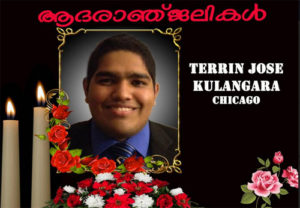 ചിക്കാഗോ: പരേതനായ ജോസ് കുളങ്ങരയുടെയും ത്രേസ്യാമ്മ (വല്സ) കുളങ്ങരയുടെയും പുത്രന് ടെറിന് ജോസ് കുളങ്ങര ചിക്കാഗോയില് നിര്യാതനായി. ചിക്കാഗോ സെന്റ് മേരീസ് ക്നാനായ ഇടവകാംഗമാണ് ഡീപോള് കോളേജിലെ വിദ്യാര്ത്ഥിയായിരുന്ന ടെറിന്. ടിജോ & ടോബിന് സഹോദരങ്ങള്. മാതാവ് വത്സ മഞ്ഞാങ്കല് കുടുംബാംഗമാണ്. സംസ്കാരം പിന്നീട്.