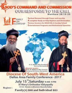 ഡാളസ്: സൗത്ത് വെസ്റ്റ് അമേരിക്കന് ഓര്ത്തഡോക്സ് ഭദ്രാസനത്തിന്റെ ഡാളസ് ഏരിയ ഫാമിലി കോണ്ഫറന്സ് ജൂലൈ 15-നു ഡാളസ് സെന്റ് മേരീസ് വലിയ പള്ളിയില് വച്ചു നടത്തും.