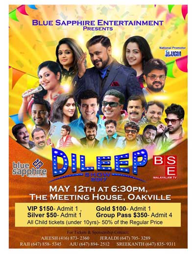 ടൊറന്റോ: ബ്ലൂ സ്റ്റാര്‍ എന്റര്‍ടെയിന്‍മെന്റിന്റെ ആഭിമുഖ്യത്തില്‍ മെയ് 12ന് ടൊറന്റോയില്‍ വച്ച് നടത്തപ്പെടുന്ന ‘ദിലീപ് ഷോ 2017’ എങ്ങും മികച്ച പ്രതികരണം. 2015 മുതല്‍ കലാ സാംസ്കാരിക പ്രവര്‍ത്തനങ്ങളില്‍ കൂടി പല സാമൂഹിക നല്‍മകള്‍ക്കും തുടക്കം കുറിച്ച ബിഎസ്ഇ(ആടഋ) നടത്തുന്ന മൂന്നാമത് സ്‌റ്റേജ് ഷോയാണ് ദിലീപ് ഷോ.