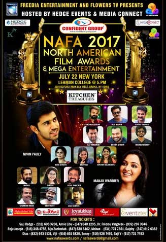 ഫ്രീഡിയ എന്റര്‍ടൈന്മെന്റും കോണ്‍ഫിഡന്റ് ഗ്രൂപ്പും ഫ്‌ളവേര്‍സ് ടി വിയും ചേര്‍ന്ന് അവതരിപ്പിക്കുന്ന രണ്ടാമത് അമേരിക്കന്‍ നാഫ ഫിലിം അവാര്‍ഡ് 2017 ന്റെ ടിക്കറ്റുകള്‍ ഇനിമുതല്‍ ഓണ്‍ലൈനില്‍ വാങ്ങാം. അമേരിക്കയിലെ ഏറ്റവും വലിയ താര നിശയുടെ ടിക്കറ്റുകള്‍ ഇനി ഓണ്‍ലൈനില്‍ ലഭ്യമാക്കുന്നത് ഇവന്റ്‌സര്‍ എന്ന സൈറ്റാണ്. നാഫയുടെ രണ്ടാമത് പുരസ്കാര ചാടങ്ങാണ് 2017 ജൂലൈ 21 മുതല്‍ 23 വരെ അമേരിക്കയുടെ രണ്ടു പ്രധാന നഗരങ്ങളായ ന്യൂ യോര്‍ക്കിലും ചിക്കാഗോയിലും ആയിരക്കണക്കിന് കാണികളുടെ സാന്നിധ്യത്തില്‍ മലയാള സിനിമയിലെ ഏറ്റവും മികച്ച അവാര്‍ഡ് ദാന ചടങ്ങിന് വേദി ഒരുക്കുന്നത്. അതുകൊണ്ടുതന്നെ സ്വാഭാവികമായി ഉണ്ടാകുന്ന തിരക്കുകള്‍ ഒഴിവാക്കുവാന്‍ ആണ് ടിക്കറ്റുകള്‍ ഓണ്‍ ലൈന്‍ സംവിധാനത്തിലൂടെ എല്ലാവര്ക്കും ലഭ്യമാക്കുവാന്‍ അവസരം ഒരുക്കിയതെന്നു നാഫാ ഡയറക്ടര്‍ ആനി ലിബു പറഞ്ഞു. ടിക്കറ്റിന്റെ വര്‍ദ്ധിച്ചുവരുന്ന ആവശ്യകതയെ തുടര്‍ന്ന് സംഘാടകര്‍ ടിക്കറ്റിന്റെ ലഭ്യതക്കായി ഓണ്‍ലൈന്‍ സൗകര്യം ഒരുക്കിയിരിക്കുന്നത് .