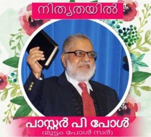 അറ്റ്ലാന്റ: പള്ളിപ്പാട് കുമ്പംപുഴ (മുട്ടം ഗ്രേയ്സ് കോട്ടേജ്) വീട്ടില് പാസ്റ്റര് പോള് പോത്തന് (മുട്ടം പോള് സാര്- 83) കാലിഫോര്ണിയയില് ഏപ്രില് 9 ന് നിര്യാതനായി. സ്വദേശമായ ഓടനാവട്ടം ഹൈസ്കൂളില് അധ്യാപന ജീവിതം ആരംഭിച്ചെങ്കിലും വിവാഹത്തോടെ പള്ളിപ്പാട് നടുവട്ടം എന്.എസ്.എസ്. ഹൈസ്കൂളിലേക്കു മാറി.