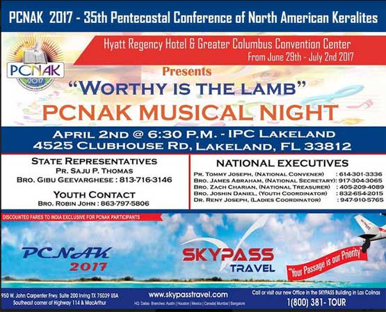 ഒര്ലാന്റോയിലെയും, ലേക്ലാന്റിലെയും ഫ്ലോറിഡയിലെ മറ്റ് സമീപപ്രദേശ ങ്ങളില് നിന്നുമായും വിവിധ സഭകളുടെ ശുശ്രുഷകന്മാരും സഭാപ്രതിനിധികളും യോഗത്തില് സംബന്ധിക്കും. പി.സി.എന്.എ.കെ മഹാസമ്മേളനത്തിന്റെ ഒരുക്ക ങ്ങള് പൂര്ത്തിയായി വരുന്നെന്ന് മീഡിയ കോര്ഡിനേറ്റര് രാജന് ആര്യപ്പള്ളില് അറിയിച്ചു. 35മത് കോണ്ഫ്രന്സ് ഒഹായോ പട്ടണത്തിലുള്ള ഹയാത്ത് റീജന്സി ഹോട്ടല് സമുച്ചയത്തില് ജൂണ് 29 മുതല് ജൂലൈ 2 വരെ നടത്തപ്പെടും. കൂടുതല് വിവരങ്ങള്ക്ക്: ജിബു വര്ഗീസ്: 813 716 3146, റോബിന് ജോണ്: 863 797 5806