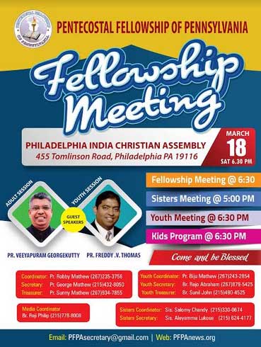 ഫിലദല്‍ഫിയ : പെന്തക്കോസ്തല്‍ ഫെല്ലോഷിപ്പ് ഓഫ് പെന്‍സില്‍വേനിയുടെ ആഭ്യമുഖ്യത്തിലുള്ള ഫെല്ലോഷിപ്പ് മീറ്റിംഗ് 2017 മാര്‍ച്ച് 18 ശനിയാഴ്ച വൈകിട്ട് 6.30 -നു ഫിലദല്‍ഫിയ ഇന്‍ഡ്യ ക്രിസ്ത്യന്‍ അസംബ്ലി ചര്‍ച്ച് (455 Tomlinson Road, Philadelphia PA 19116) വെച്ച് നടത്തപ്പെടുന്നു. പ്രശസ്ത ദൈവദാസന്‍മാരായ പാസ്റ്റര്‍. വിയ്യപുരം ജോര്‍ജ്ജ്കുട്ടി, പാസ്റ്റര്‍. ഫ്രെഡി. വി. തോമസ് തുടങ്ങിയവര്‍ ദൈവവചനം ശുശ്രൂഷിക്കുന്നു. അന്നേ ദിവസം വൈകുന്നേരം 5.00 ന് ലേഡീസ് മീറ്റിംഗും, 6.30 ന് യുവജനങ്ങള്‍ക്കായും ചില്‍ഡ്രന്‍സ് സെക്ഷനുകളും നടത്തപ്പെടുന്നു.