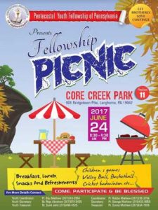 ഫിലാഡല്‍ഫിയ: പെന്തകോസ്തല്‍ യൂത്ത് ഫെല്ലോഷിപ്പ് ഓഫ് പെന്‍സില്‍വേനിയുടെ (PYFP) ആഭിമുഖ്യത്തിലുള്ള ആന്യുല്‍ പിക്‌നിക് 2017 ജൂണ്‍ 24ാം തീയതി രാവിലെ 8.30 മുതല്‍ 4.30 പി.എം വരെ കോര്‍ ക്രീക് പാര്‍ക്ക് (പവലിയന്‍ 11) 901 Bridge Town pike, Langhorne, PA 19047) വെച്ച് നടത്തപ്പെടുന്നു. എല്ലാ വിവിധ പ്രായക്കാര്‍ക്കും പങ്കെടുക്കത്തക്കരീതിയിലുള്ള പ്രത്യേകം സ്‌പോര്‍ട്‌സ് ആക്റ്റിവിറ്റീസ്, ക്രിക്കറ്റ്, വോളിബോള്‍, ഫുട്‌ബോള്‍, ബാഡ്മിന്റന്‍ തുടങ്ങിയവയും നടത്തപ്പെടുന്നു.