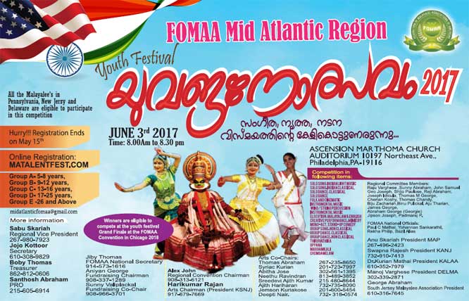 ജൂണ് 3 ശനിയാഴ്ച രാവിലെ 8 മുതല് വൈകിട്ട് 8:30 വരെ ഫിലാഡല്ഫിയ അസന്ഷന് ചര്ച്ച് ഓഡിറ്റോറിയത്തില് വച്ചാണ് യുവജനോത്സവം നടത്തപ്പെടുന്നത്, പ്രവാസിമലയാളികളിലെ കലാതിലകങ്ങളെയും കലാപ്രതിഭകളെയും കണ്ടെത്തുവാന് നടത്തുന്ന ഈ മത്സരങ്ങള് അമേരിക്കയിലെ രണ്ടാം തലമുറയിലെയും മൂന്നാം തലമുറയിലെയും കുട്ടികള്ക്ക് നവ്യാനുഭവമായിരിക്കും.അതിന്റെ ഭാഗമായി ഫോമായുടെ പന്ത്രണ്ട് റീജിയണുകളില് മത്സരങ്ങള് സംഘടിപ്പിക്കുകയും അതില് ഒന്നും രണ്ടും സ്ഥാനങ്ങള് നേടുന്ന വിജയികള് 2018 ല് ചിക്കാഗോയില് അരങ്ങേറുന്ന അന്തര്ദേശീയ കുടുംബ സമ്മേളനത്തോടനുബന്ധിച്ചു നടത്തുന്ന മത്സരങ്ങളില് പങ്കെടുക്കുവാനുള്ള അവസരം ലഭിക്കും.. കലാപ്രതിഭ, കലാതിലകം, ജൂനിയര് കലാപ്രതിഭ, ജൂനിയര് കലാതിലകം പട്ടങ്ങളും ക്യാഷ് അവാര്ഡുകളും സമ്മാനിക്കും. കൂടാതെ മറ്റ് വിജയികള്ക്ക് സര്ട്ടിഫിക്കറ്റുകളും നല്കുന്നതായിരിക്കും.