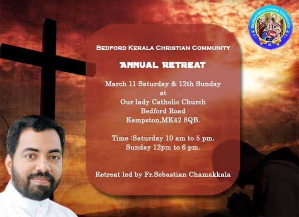 ബെഡ്‌ഫോര്‍ഡ്: ഈസ്റ്റ് ആംഗ്ലിയായിലെ പ്രമുഖ വിശ്വാസി കൂട്ടായ്മ്മയും,സീറോ മലബാര്‍ കുര്‍ബ്ബാന കേന്ദ്രവുമായ ബെഡ്‌ഫോര്‍ഡില്‍ വലിയ നോമ്പുകാലത്തോടനുബന്ധിച്ച് വാര്‍ഷീക ധ്യാനം സംഘടിപ്പിക്കുന്നു. വെസ്റ്റ്മിന്‍സ്റ്റര്‍ അതിരൂപതയിലെ സീറോ മലബാര്‍ ചാപ്ലിനും,പ്രമുഖ ചിന്തകനും,വാഗ്മിയും ആയ ഫാ.സെബാസ്റ്റിയന്‍ ചാമക്കാല ദ്വിദിന വചന ശുശ്രുഷ നയിക്കും.