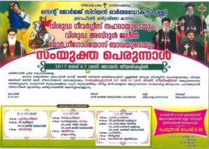 ടോറന്ററ്റോ: ബ്രാപ്ടണ് സെന്റ് ജോര്ജ് സിറിയക്ക് ഓര്ത്തഡോക്സ് പള്ളിയില് മഹാപരിശുദ്ധനായ വി.ഗീവര്ഗ്ഗീസ് സഹദായുടെയും വി.അബ്ദുള് ജലീല് മാര് ഗ്രിഗോറീസ് ബാവായുടേയും സംയുക്ത ഓര്മ്മ പെരുന്നാള് 2017 ജൂലൈ മാസം 06, 07(ശനി, ഞായര്) ദിവസങ്ങളില് ഭക്ത്യാദരപൂര്വ്വം കൊണ്ടാടപ്പെടുന്നു. പെരുന്നാള് ദിവസങ്ങളില് വിശ്വാസികള് എല്ലാവരും പ്രാര്ത്ഥനകളിലും കുര്ബാനയിലും ധ്യാന യോഗത്തിലും ആദിയോടന്തം നേര്ച്ച കാഴ്ചകളോടെ വന്ന് സംബന്ധിച്ച് അനുഗ്രഹം പ്രാപിക്കുവാന് നമ്മുടെ കര്ത്താവായ യേശുമശിഹായുടെ പരിശുദ്ധ നാമത്തില് ക്ഷണിച്ചുകൊള്ളുന്നു.