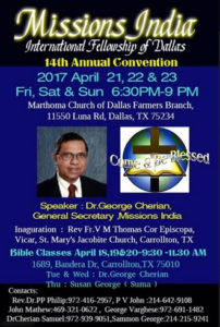 ഡാളസ്: മിഷന്സ് ഓഫ് ഇന്ത്യ ഇന്റര്നാഷണല് ഫെല്ലോഷിപ്പ് ഓഫ് ഡാളസ് പതിനാലാമത് വാര്ഷിക കണ്വന്ഷന് ഏപ്രില് 21 മുതല് 23 വരെ വൈകിട്ട് 6.30 വരെ നടത്തപ്പെടുന്നു.