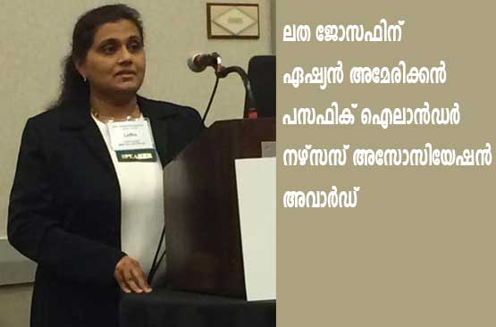 ഷിക്കാഗോ: ഏഷ്യന് അമേരിക്കന് പസഫിക് ഐലാന്ഡര് നഴ്സസ് അസോസിയേഷന്റെ (എ.എ.പി.ഐ.എന്.എ) 2017-ലെ അക്കാഡമിക് അവാര്ഡിനു നോര്ത്ത് കരോലിനയില് നിന്നുള്ള ലത ജോസഫ് അര്ഹയായി. അമേരിക്കയില് നഴ്സിംഗ് ഉപരിപഠനം നടത്തുന്ന ഇന്ത്യ, ചൈന, ജപ്പാന്, കൊറിയ, പാക്കിസ്ഥാന്, ഫിലിപ്പീന്സ് തുടങ്ങിയ ഏഷ്യന് വംശജര്ക്കും, ഹാവായ് ഉള്പ്പെടുന്ന പസഫിക് ദ്വീപ് സമൂഹങ്ങളില് നിന്നുള്ളവര്ക്കും അംഗത്വം നല്കുന്ന നഴ്സുമാരുടെ ഔദ്യോഗിക സംഘടനയാണ് എ.എ.പി.ഐ.എന്.എ (ആപീനാ) എന്നറിയപ്പെടുന്ന ഏഷ്യന് അമേരിക്കന് പസഫിക് ഐലാന്ഡര് നഴ്സസ് അസോസിയേഷന്.