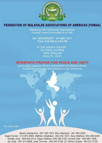 ഫ്ളോറിഡ: അമേരിക്കന് ഐക്യ നാടുകളില് സമീപ കാലത്ത് ഇന്ത്യാക്കാര്ക്കെതിരെ വര്ധിച്ചുവരുന്ന വംശീയ ആക്രമണങ്ങളിലും കൊലപാതക പരമ്പരകളിലും ശക്തമായ പ്രതിഷേധം രേഖപ്പെടുത്തി അധികൃതരുടെ ശ്രദ്ധനേടുന്നതിനും ബോധവല്കരണം നടത്തുന്നതിനുമായി മലയാളികളുടെ ബൃഹത് കൂട്ടായ്മയായ ഫോമയുടെ (ഫെഡറേഷന് ഓഫ് മലയാളി അസോസിയേഷന്സ് ഓഫ് അമേരിക്കാസ്) ആഭിമുഖ്യത്തില് സര്വമത പ്രാര്ത്ഥനയും പൊതുസമ്മേളനവും സംഘടിപ്പിച്ചിരിക്കുന്നു. ഫ്ളോറിഡയിലെ ഗാന്ധി സ്ക്വയറില് (എമഹരീി െഘലമ ജമൃസ, 14900 ടശേൃഹശിഴ ഞറ, ഉൃശ്ല, എഘ33331) മെയ് 10-ാം തീയതി വൈകുന്നേരം അഞ്ചുമണി മുതല് 6.30 വരെയാണ് സമ്മേളന പരിപാടികള്. സര്വമത പ്രാര്ത്ഥനയോടൊപ്പം, ഇന്ത്യന് കമ്മ്യൂണിറ്റിയില് ഐക്യവും അഖണ്ഡതയും സമാധാനവും ഊട്ടിയുറപ്പിക്കുക എന്ന ലക്ഷ്യത്തോടെ നടത്തുന്ന പൊതുസമ്മേളനത്തില് നിയമഞ്ഞരും പോലീസ് ഉദ്യോഗസ്ഥരും സാമൂഹിക സാംസ്കാരിക നേതാക്കളും പങ്കെടുക്കുമെന്ന് ഫോമ നാഷണല് പ്രസിഡന്റ് ബെന്നി വാച്ചാച്ചിറ അറിയിച്ചു.