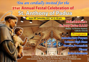 ഹ്യൂസ്റ്റണ്‍ : അത്ഭുത പ്രവര്‍ത്തകനായ പാദുവായിലെ വിശുദ്ധ അന്തോണീസ് പുണ്യവാളന്‍റ്റെ ഇരുപത്തി ഒന്നാമത് വാര്‍ഷിക തിരുനാള്‍ 2017 ജൂണ്‍ 10 ശനിയാഴ്ച വൈകുന്നേരം 7 മണിയ്ക്ക് ഹ്യൂസ്റ്റണിലെ ഷുഗര്‍ ലാന്‍ഡിലുള്ള സെന്‍റ്റ് ലോറന്‍സ് കത്തോലിക്കാ പള്ളിയില്‍ വച്ചു ബഹു. സാന്‍റ്റി കുര്യന്‍ അച്ചന്‍റ്റെ (സെന്‍റ്റ് അക്വിനാസ് പള്ളി വികാരി) മുഖ്യ കാര്‍മ്മികത്വത്തിലും, വിവിധ വൈദികരുടെ സഹകാര്‍മ്മികത്വത്തിലും ഭക്ത്യാതരപൂര്‍വ്വം കൊണ്ടാടുന്നതാണ്. പ്രാര്‍ത്ഥന, കൊന്ത, ആഘോഷമായ പാട്ടുകുര്‍ബ്ബാന, നൊവേന, തിരുസ്വരൂപങ്ങളും പുണ്യവാളന്‍റ്റെ തിരുശേഷിപ്പും വഹിച്ചുകൊണ്ടുള്ള ഭക്തിനിര്‍ഭരമായ പ്രദക്ഷിണം, സ്‌നേഹവിരുന്ന്, കലാപരിപാടികള്‍ തുടങ്ങിയവ ഉണ്ടായിരിക്കുന്നതാണ്.