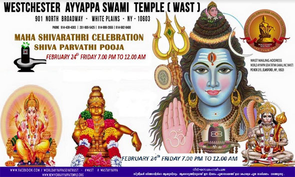 ന്യൂയോര്ക്ക്: വെസ്റ്റ്ചെസ്റ്റര് അയ്യപ്പ ക്ഷേത്രത്തിലെ ശിവരാത്രി ആഘോഷം ഈ വെള്ളിയാഴിച്ച(02/24) വൈകിട്ട് 7 മണി മുതല് 12 മണിവരെ നടത്തുന്നതാണ്.ലോകൈക നാഥനായ പരമശിവനുവേണ്ടി പാര്വതീദേവി ഉറക്കമിളച്ചുപ്രാര്ഥിച്ച രാത്രിയാണ് ശിവരാത്രി എന്നാണ് വിശ്വസം. ശിവരാത്രിവ്രതം നോക്കിയാല് ജന്മാന്തരപാപങ്ങളൊഴിഞ്ഞ് കര്മ്മരംഗം തെളിയുന്നതിനും മോക്ഷപ്രാപ്തി നേടുകയും, സര്വ്വപാപങ്ങളും തീര്ക്കുന്നതാണ് ശിവരാത്രിവ്രതാചരണം എന്നാണ് വിശ്വസം.ശിവപ്രീതിക്ക് ഏറ്റവും നല്ലദിവസവും ഇതുതന്നെ.