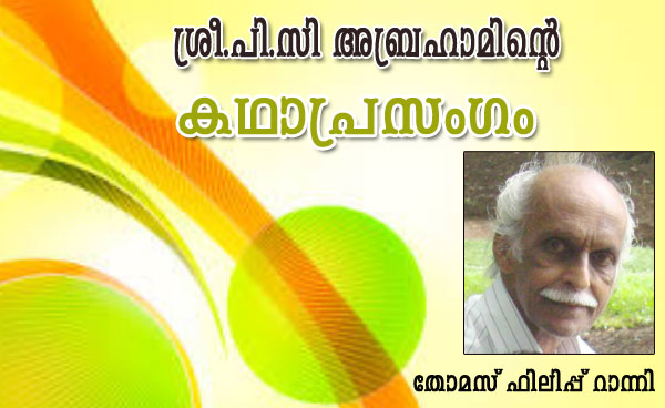 എന്നു ശ്രുതിമധുരമായി പാടിക്കൊണ്ടു കഥാപ്രസംഗം നടത്തുന്ന പി സി അബ്രഹാം എന്ന ആ അതുല്യ പ്രതിഭാവിലാസത്തെ അഥവാ കാഥികനെ ആരാധാനാദരവുകളോടു കൂടി ഞാനിന്നും ഓര്ക്കുന്നു. എന്റേയും ബാല്യത്തില്, ഞാന് പഠിച്ചിരുന്ന റാന്നിയിലെ ഒരു െ്രെപമറിസ്കൂളിലെ ഒരു വലിയ സദസ്സിന്റെ മുമ്പില് വെച്ച് വള്ളത്തോളിന്റെ പ്രശസ്തമായ മഗ്ദലനമറിയം എന്ന ഖണ്ഡകാവ്യത്തെ ആസ്പദമാക്കിക്കൊണ്ടുള്ള ഹൃദയാഹ്ളാദഹാരിയായ അദ്ദേഹത്തിന്റെ കഥാപ്രസംഗം കേള്ക്കുവാനുള്ള ഭാഗ്യം എനിക്കും ഉണ്ടായി. എന്റെ ഹൃദയത്തെ ഏറെ സ്വാധീനിച്ച ആസ്വാദ്യമധുരമായ കഥാപ്രസംഗവും അതായിരുന്നു.