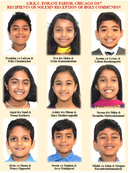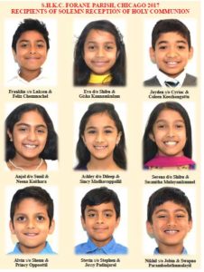 ഷിക്കാഗോ: ഷിക്കാഗോ തിരുഹൃദയ ക്നാനാ!യ കത്തോലിക്കാ ഫൊറോനാ പള്ളിയില്, മൂന്നാം ക്ലാസ്സിലെ മതബോധന വിദ്യാര്ത്ഥികളുടെ ആദ്യകുമ്പസാരം മെയ് 20 നും, ആഘോഷമായ വിശുദ്ധ കുര്ബാന സ്വീകരണം മെയ് 27 ശനിയാഴ്ച 3 മണിക്കും നടത്തപ്പെടുന്നു.