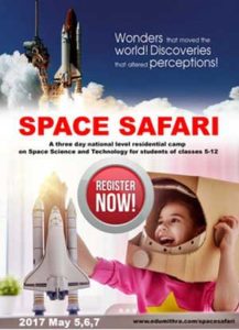 മെയ് 5,6,7 തീയതികളിലായി മൂഴിക്കുളം ശാലയില് വച്ച് നടത്തുന്ന ക്യാമ്പില് വാനനിരീക്ഷണത്തിലൂടെയും ബഹിരാകാശ സോഫ്റ്റ് വെയറുകളിലൂടെയും ബഹിരാകാശരംഗത്തെ പ്രഗത്ഭര് കുട്ടികളോട് സംവദിക്കുന്നു. അഞ്ചാം ക്ലാസ് മുതല് പന്ത്രണ്ടാം ക്ലാസ് വരെയുള്ള കുട്ടികള്ക്ക് ഈ ക്യാമ്പില് പങ്കെടുക്കാം. പാഠപുസ്തകങ്ങളിലൂടെ മാത്രം വായിച്ചറിഞ്ഞ ആകാശകൗതുകകാഴ്ചകള് അനുഭവിച്ചറിയുന്നതിന് ഈ ക്യാമ്പ് പ്രയോജനപ്പെടുത്താം. കൂടുതല് വിവരങ്ങള്ക്ക് സന്ദര്ശിക്കുക : www.edumithra.com/spacesafari