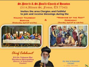 ഹൂസ്റ്റണ്: പരിശുദ്ധ പത്രോസ് പൗലോസ് ശ്ലീഹന്മാരുടെ നാമധേയത്തിലുള്ള ഹൂസ്റ്റണിലെ ഫ്രസ്റ്റോ ഇല്ലിനോയിസ് സ്ട്രീറ്റിലുള്ള സെന്റ് പീറ്റേഴ്സ് ആന്ഡ് സെന്റ് പോള്സ് ഓര്ത്തഡോക്സ് ദേവാലയത്തില് ഏപ്രില് 12, 13 (ബുധന്, വ്യാഴം) തീയതികളില് പെസഹായും കാല്കഴുകല് ശുശ്രൂഷയും നടത്തുന്നു.