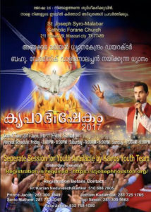 ഹ്യൂസ്റ്റന്: ഹ്യൂസ്റ്റനിലെ സെന്റ് ജോസഫ്സ് സീറൊ മലബാര് കത്തോലിക്കാ ഫൊറോന ദേവാലയത്തില് വെച്ച് അണകര മരിയന് ധ്യാനകേന്ദ്രം ഡയരക്ടര് ബഹുമാനപ്പെട്ട ഡോമനിക് വാളന്മാലച്ചന് നയിക്കുന്ന ആത്മീയധ്യാനം ജൂണ് 9-ാംതീയതി വെള്ളിയാഴ്ച വൈകുന്നേരം 3 മണിക്ക് ആരംഭിച്ച്, രാത്രി 8 മണിക്ക് അവസാനിക്കും. തുടര്ന്ന്, പിറ്റേന്ന് ജൂണ് 10 (ശനി), ജൂണ് 11 (ഞായര്) ദിവസങ്ങളില് രാവിലെ 9ന് ആരംഭിച്ച് വൈകുന്നേരം 6ന് അവസാനിക്കും. ശനിയും, ഞായറും കുട്ടികള്ക്കും യുവജനങ്ങള്ക്കുമായി കായ്റോസ് യൂത്ത് ടീം ഒരുക്കുന്ന പ്രത്യേകമായ ധ്യാന സെഷനുമുണ്ടായിരിക്കും. പള്ളിയിലും, പള്ളിയുടെ സെന്റ് ജോസഫ് ഹാളിലും, പ്രത്യേക ടെന്റുകളിലുമായി പ്രത്യേകവും വിപുലവുമായ സജ്ജീകരണങ്ങളാണ് ഒരുക്കിയിരിക്കുന്നത്. എല്ലാ ക്രിസ്ത്യന് മതവിശ്വാസികളേയും മറ്റ് എല്ലാ മതവിശ്വാസികളേയും ഈ ആത്മീയ അഭിഷേക ധ്യാനത്തിലേക്ക് സംഘാടകര് സ്വാഗതം ചെയ്തിട്ടുണ്ട ്.