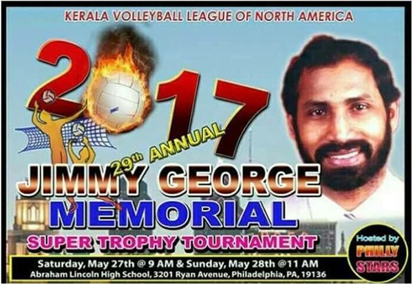 09:33 pm 25/5/2017 – ജോജോ കോട്ടൂര് ഫിലാഡല്ഫിയാ: കേരളത്തിന്റെ കായികസംസ്കൃതിയെ അന്തരാഷ്ട്ര തലങ്ങളിലെത്തിച്ച് പ്രതിഭയുടെ നിറവിലും പ്രശസ്തിയുടെ തികവിലും പ്രശോഭിക്കവേ, അകാലത്തില് വിധിക്കു കീഴടങ്ങേണ്ടി വന്ന വോളിബോള് ഇതിഹാസം ജിമ്മി ജോര്ജിന്റെ സ്മരണാര്ത്ഥം നടക്കുന്ന 29-ാമത് ജിമ്മി ജോര്ജ് മെമ്മോറിയല് സൂപ്പര് ട്രോഫി ടൂര്ണ്ണമെന്റിനുള്ള ഒരുക്കങ്ങള് പൂര്ത്തിയായി. കേരള വോളിബോള് ലീഗ് ഓഫ് നോര്ത്ത് അമേരിക്കയുടെ ആഭിമുഖ്യത്തില് മെയ് 27, 28 തീയതികളില് ഫിലഡെല്ഫിയയിലെ എബ്രഹാം ലിങ്കണ് സ്ക്കൂളില് (3201 RYAN AVE, PHILADELPHIA, PA, Read more about ആരവങ്ങള് ഇരമ്പുന്നു; ആര്പ്പുവിളികള് മുഴങ്ങുന്നു, ജിമ്മി ജോര്ജ് മെമ്മോറിയല് സൂപ്പര് ട്രോഫി ടൂര്ണമെന്റ്[…]