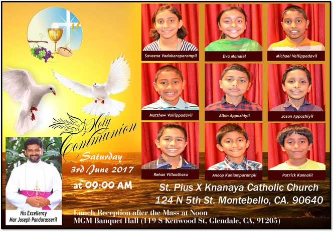 07:28 am 4/6/2017 ഹ്യൂസ്റ്റണ് : അത്ഭുത പ്രവര്ത്തകനായ പാദുവായിലെ വിശുദ്ധ അന്തോണീസ് പുണ്യവാളന്റ്റെ ഇരുപത്തി ഒന്നാമത് വാര്ഷിക തിരുനാള് 2017 ജൂണ് 10 ശനിയാഴ്ച വൈകുന്നേരം 7 മണിയ്ക്ക് ഹ്യൂസ്റ്റണിലെ ഷുഗര് ലാന്ഡിലുള്ള സെന്റ്റ് ലോറന്സ് കത്തോലിക്കാ പള്ളിയില് വച്ചു ബഹു. സാന്റ്റി കുര്യന് അച്ചന്റ്റെ (സെന്റ്റ് അക്വിനാസ് പള്ളി വികാരി) മുഖ്യ കാര്മ്മികത്വത്തിലും, വിവിധ വൈദികരുടെ സഹകാര്മ്മികത്വത്തിലും ഭക്ത്യാതരപൂര്വ്വം കൊണ്ടാടുന്നതാണ്. പ്രാര്ത്ഥന, കൊന്ത, ആഘോഷമായ പാട്ടുകുര്ബ്ബാന, നൊവേന, തിരുസ്വരൂപങ്ങളും പുണ്യവാളന്റ്റെ തിരുശേഷിപ്പും വഹിച്ചുകൊണ്ടുള്ള ഭക്തിനിര്ഭരമായ Read more about വിശുദ്ധ അന്തോണീസ് പുണ്യവാളന്റെ ഇരുപത്തി ഒന്നാമത് വാര്ഷിക തിരുനാള് ഷുഗര് ലാന്ഡില് ജൂണ് 10ന്[…]